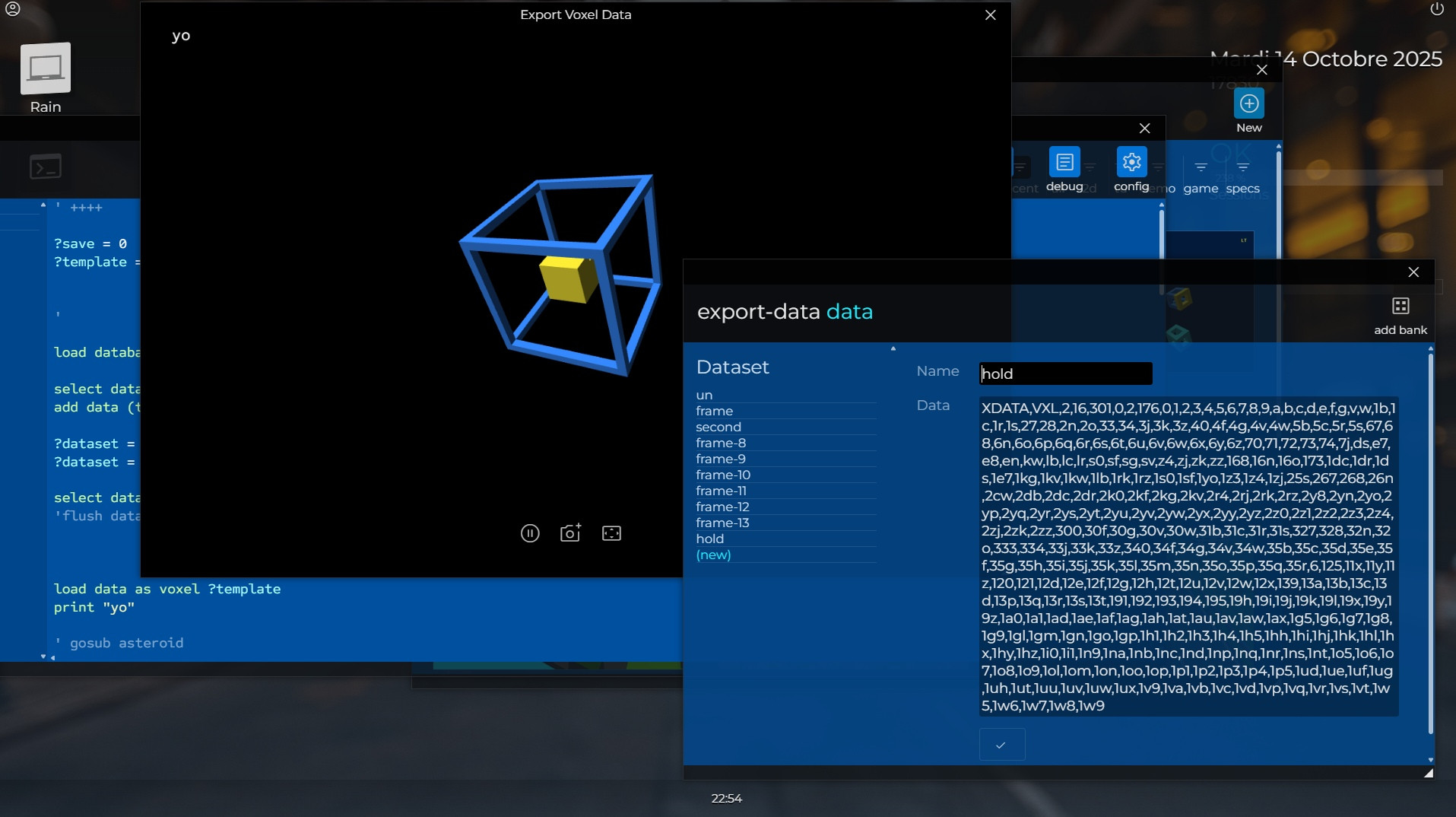 Alors ça, c'était encore un périple... l'objectif était de pouvoir exporter les voxels dans une banque de données. Avec export du front, vers le serveur. C'était la dernière étape nécessaire pour avoir la possibilité de créer ensuite un éditeur d'objets.